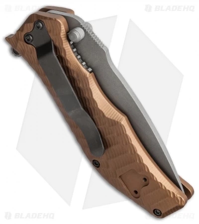 This Gun Hammer SAO (spring assisted opening) knife was modeled after Darrel Ralph’s custom design. The ergonomic tactical (ETAC) grip handle is 3D machined from aircraft grade aluminum with a copper finish. It is equipped with a premium S30V stainless steel torpedo blade with a gray finish. The blade is easily deployed using the flipper or thumb studs. The titanium lock tab is 0.09″ thick for solid lockup. Comes with a padded black nylon pouch.