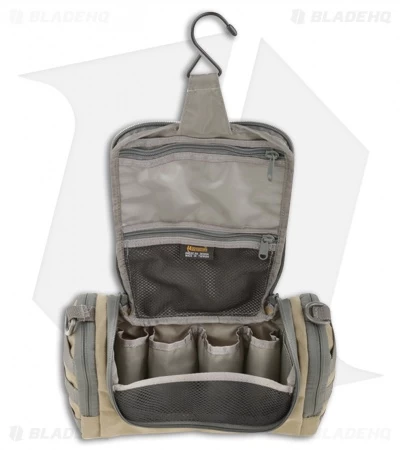 The khaki/foliage Maxpedition Aftermath™ Compact toiletry bag is a great travel companion. It holds the essentials: shampoo bottles, tooth brush and toothpaste along with other personal items in a compartmentalized fashion. The fold away hook makes it possible to hang the Aftermath in the shower and an internal zippered clear window compartment allows for an optional mirror (not included).