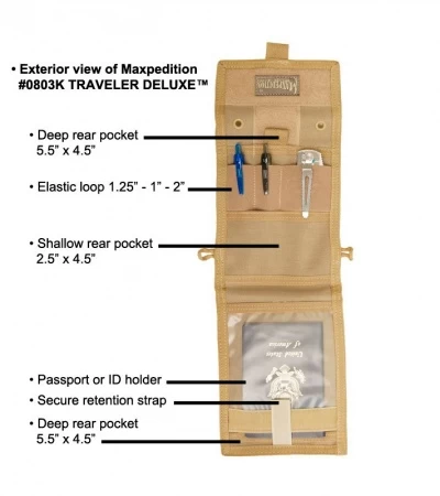The Traveler Deluxe Passport / ID carrier holds your most important travel documents close to the body. An extra large ID window provides the options of showing your identification. Two slip pockets behind the window and two slip pockets on the back all hold cellphone, cash, tickets, travel documents. Elastic band on back will hold pens or flashlights. Small clear pocket in the rear can hold phone cards, itineraries, business cards, or notes. In addition, the Deluxe Traveler flips open to reveal five (5) more slip pockets, two (2) zippered pockets, and credit card organizer.