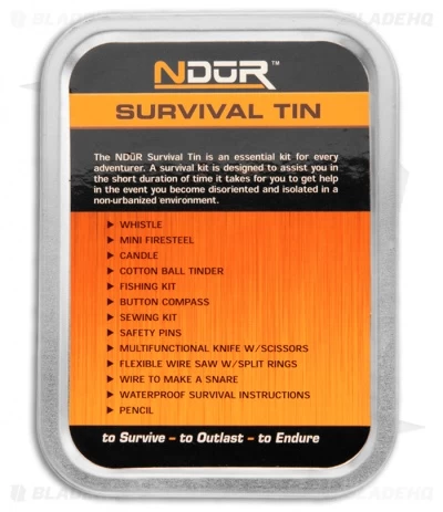 The Ndur Survival Tin is an essential kit for every adventurer. A survival kit is designed to assist you in the short duration of time it takes for you to get help in the event you become disoriented and isolated in a non-urbanized environment. Your goal is to survive the elements until you get help. NDuR’s Survival Tin has everything you need in such a situation.