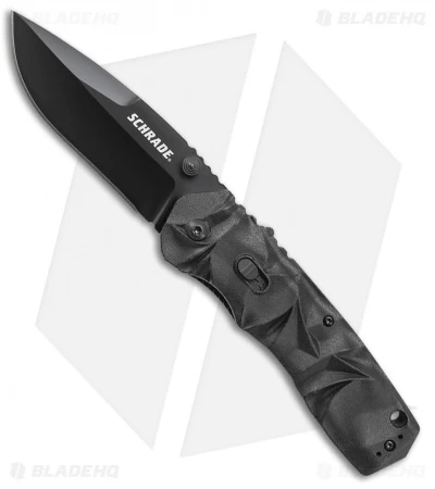 The SCHA12B Schrade MAGIC Dual Action assisted opening knife has a black finished, plain edged blade and a black coated aluminum handle.