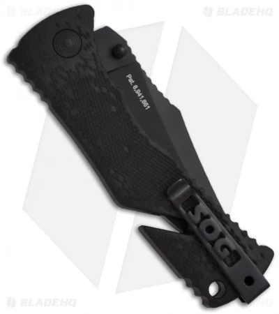 The SOG Trident (TF-7) has a black TiNi finished Tanto blade with a plain cutting edge. The handle is black glass reinforced nylon (GRN).